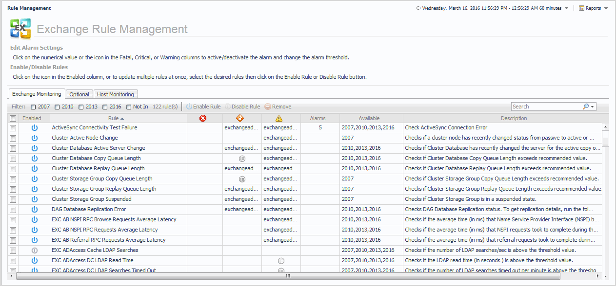 Exchange Monitoring. Displays information about the Foglight for Exchange rules.
