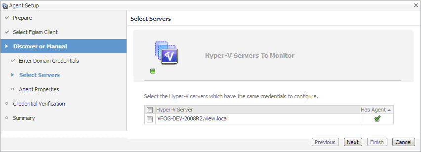The Agent Setup wizard refreshes, showing the Select Servers page. The page shows a list of all Hyper-V servers that you have access to, based on the domain name and user credentials you provided in this step.