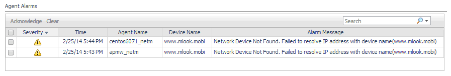 The Agent Alarms view displays the alarms generated against the existing agents.