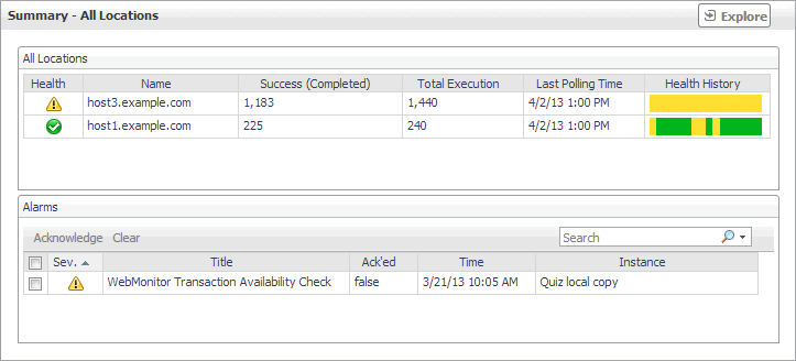 The Summary - All Locations view displays a list of existing locations, and shows any alarms generated against them.