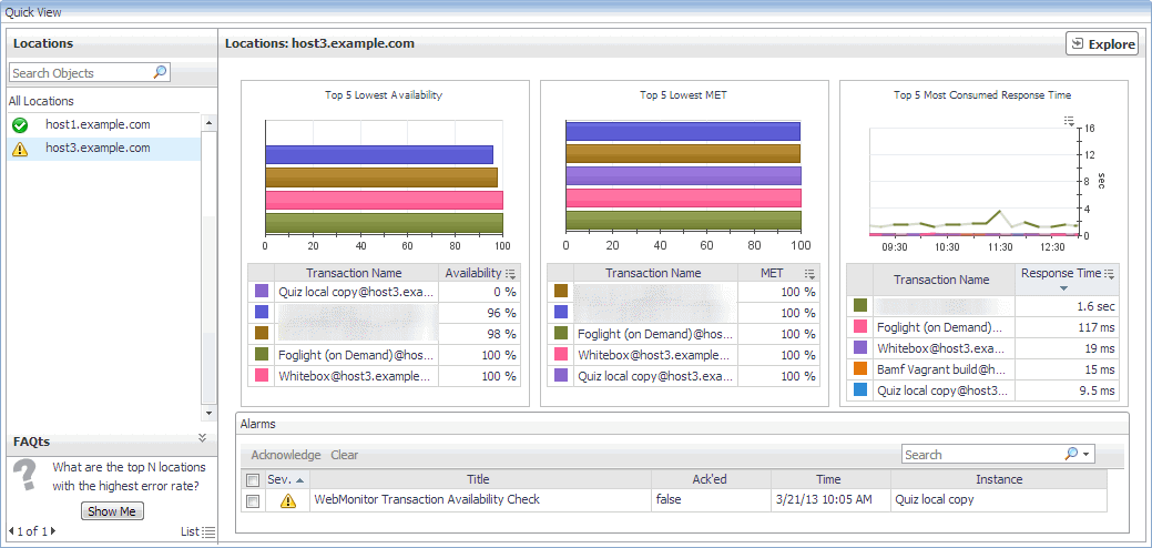 The Quick View is a container view. It contains a combination of location or transaction views, depending on your selection in the Web Monitor Environment view and the pane on the left. Use it to understand the level of user experience offered by the monitored Web sites, and to investigate any issues that they may be experiencing.