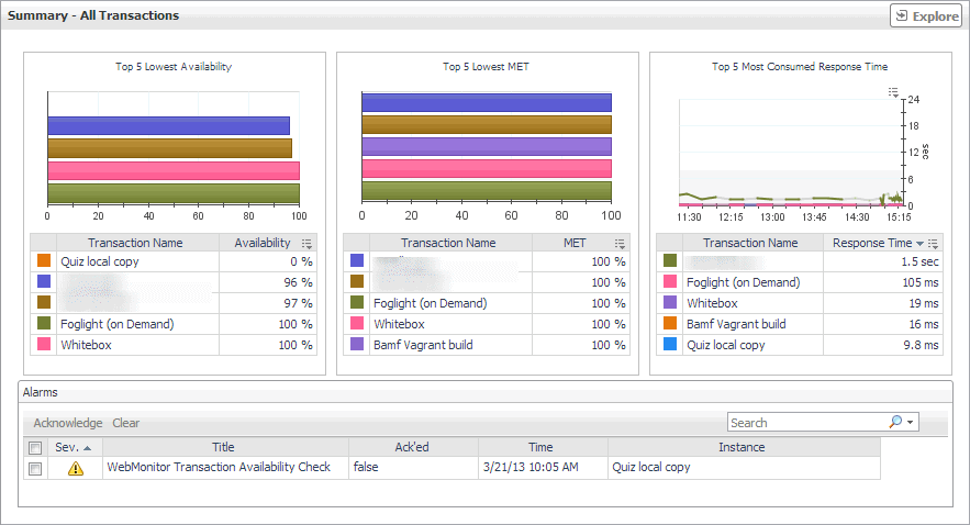 The Summary - All Transaction view displays overall response and availability information for the monitored transactions. It also identifies the transactions with the lowest availability, lowest MET (met expected time), and highest response time, showing the top five transactions in each of these categories.