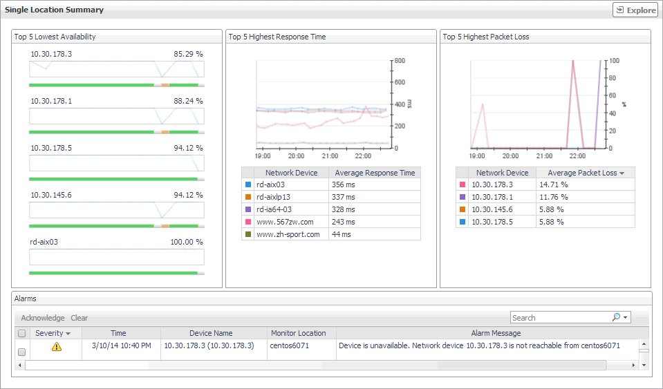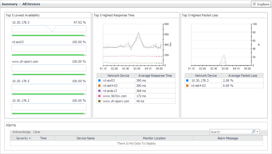 The Summary - All Devices view displays overall response and availability information for all monitored network devices. It identifies the network devices with the lowest availability, highest response time, and highest data packet loss, showing the top five network devices in each of these categories. Use this view to identify the devices with performance degradation, and to investigate them further.