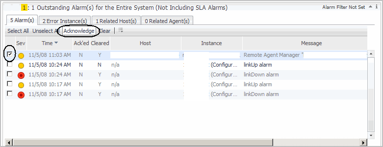 Acknowledge — if acknowledged, it indicates that the alarm has been examined. The user name of the person who acknowledged the alarm appears in the Ack’ed By column for that alarm. |