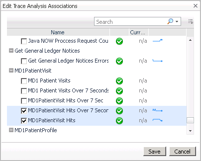 Click Edit Trace Analysis Associations to view and edit the state of the available counters that represent statistics for the monitored application. Select one or more of the available counters in the Edit Trace Analysis Associations dialog box to display their statistics in the Real User Performance detail view, under Trace Analysis. |
