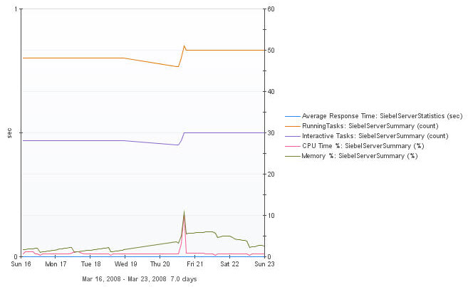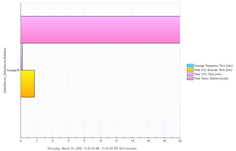 Drill down on Average Response Time (min) bar, Total SQL Execute Time (min) bar, Total CPU Times (min) bar, or Tasks Started bar. For more information, see Sieb_Srvr_Detail graph view. This displays the correlation of the Siebel server's response time with its utilization and throughput for each refresh interval. |
