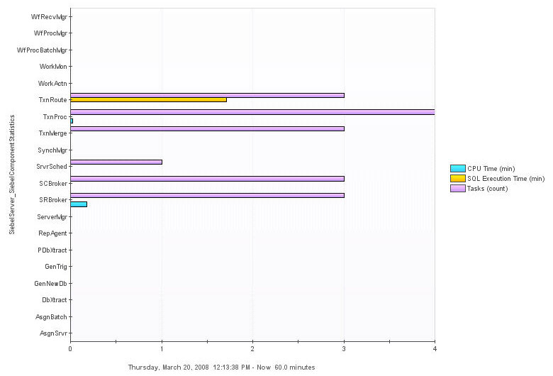 SQL Execution Time (min). Total time (minutes) the Siebel component spent performing SQL execute operations since the Siebel server started. For SELECT statements, the amount of time spent identifying the rows if the statement requires a sort or uses FOR UPDATE. For INSERT, UPDATE, and DELETE statements, the amount of time spent modifying the data. | |||