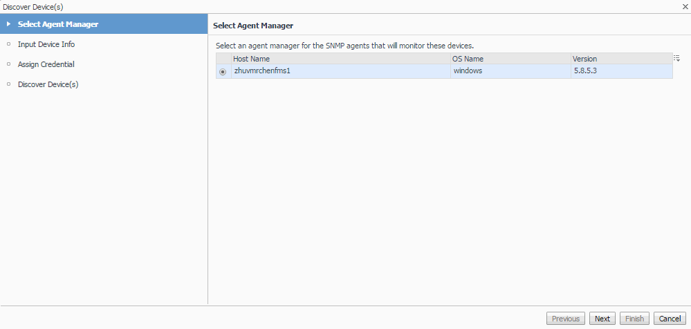 On the Select an Agent Manager page, select the Foglight Agent Manager instance that you want to use to monitor devices.