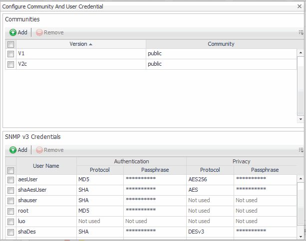 Foglight for SNMP uses public (read-only) community strings. You can add more public community strings. All community strings must be unique for each version. Therefore, you may have to run the Discover Device(s) wizard more than once to properly discover all devices in the network.