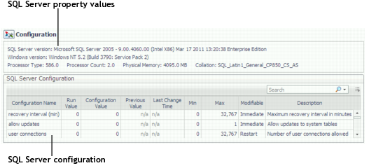 The SQL Server Configuration table displays the configuration parameters for the currently monitored SQL Server, as listed in the table below. These parameters often affect the system’s performance. Therefore, reviewing the values displayed in this table and modifying them, if needed, may successfully resolve performance issues.