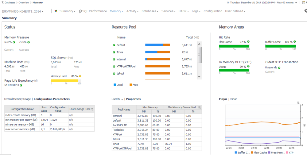 Use this panel to review any possible memory-related performance issues, and then go to the Buffer Cache or Plan Cache panels for an in-depth investigation of such issues.