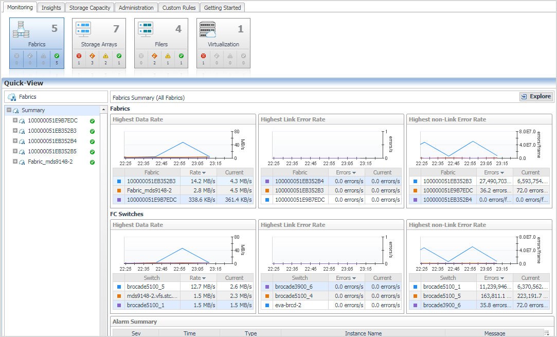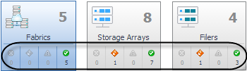 Summarizes how many of each type of device—Fabrics, Storage Arrays, and Filers—are being monitored, and breaks down the total number by alarm severity (from left to right: Fatal, Critical, Warning, and Normal). Tiles control the Quick View area as follows: