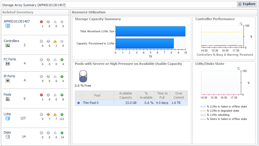 Related Inventory. Contains alarm summaries for the selected storage array and its controllers, FC ports, IP ports, pools, LUNs, and disks.