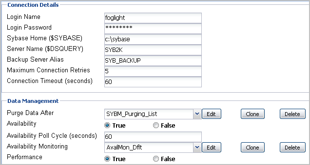 Default versions of these properties are installed with the Foglight for Sybase. However, you can edit the default shareable and agent properties, configure agent properties that apply only to a specific agent instance, and create edited clones of shareable properties that are used by a subset of the agents of a certain type.