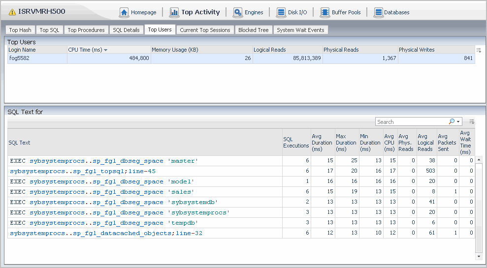 The Top SQL of Session with SPID (session process identifier) table has the same columns as the Top SQL tab, Top SQL Table.