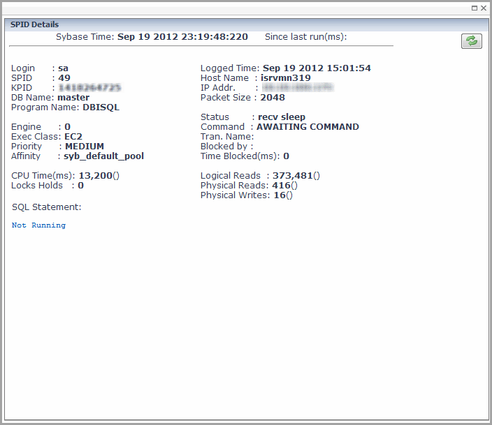 This table provides detail for SPID xx for the time period. The SPID number is selected in the Top Sessions Table.