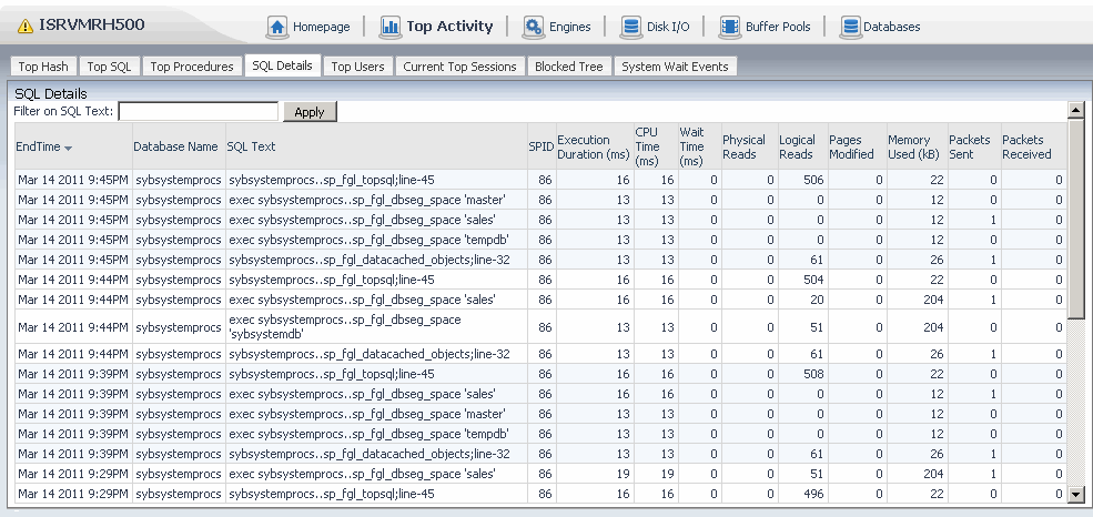 You can display the SQL details for specified SQL text using the Filter on SQL Text box and clicking Apply. You can view the full list by clicking Show All.