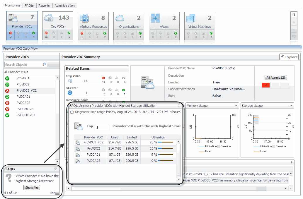 On the vCloud Environment dashboard, on the Monitoring tab, click one of the following tiles: Provider vDCs, Organization vDCs, or Organization.