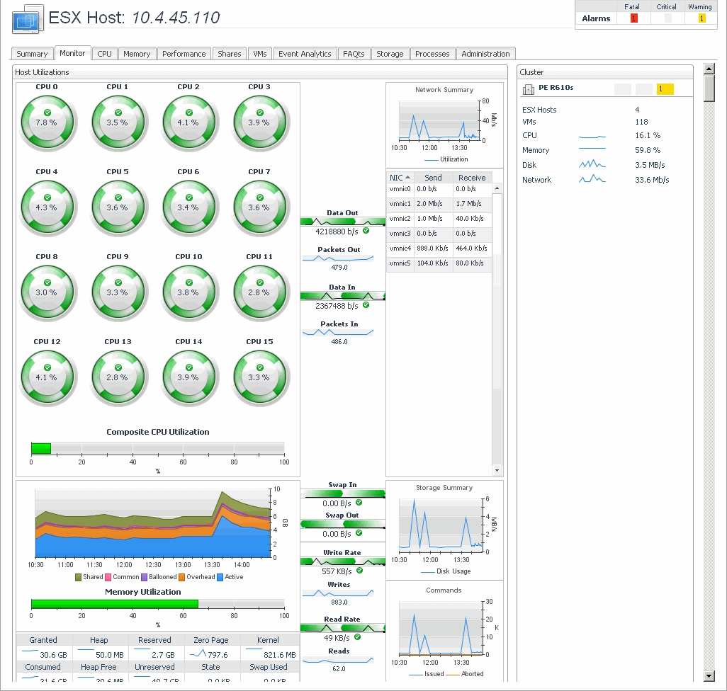 This view shows the utilization of the selected server’s resources. It shows the current CPU utilization for each CPU, and the composite CPU utilization across all CPUs on the selected ESX host. This view also provides insights into memory usage, and disk and network IO rates.