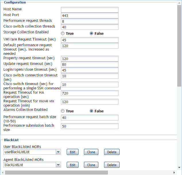 On the VMware Environment dashboard, on the Administration tab, select an agent instance and click Edit Properties (see Configuring monitoring agents for data collection ). This method only provides access to the Configuration properties, but not the Black List and Data Collection Scheduler properties.