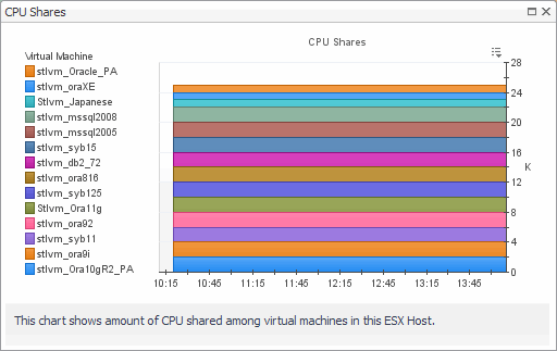 CPU Shares graph. Displays additional information about the CPU shares, indicating which virtual machines are selected and their CPU shares showing in the graph.