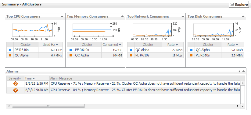 The Summary - All Clusters view displays overall resource utilization information for a group of clusters, and shows the elements that consume the highest amount of system resources.