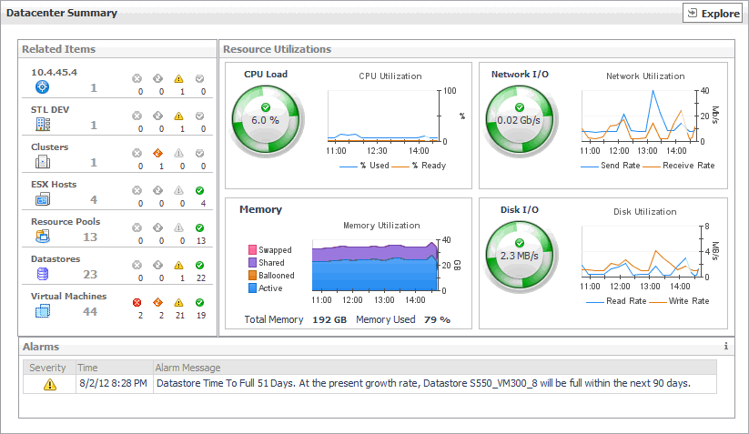 The Datacenter Summary view shows the overall resource utilization and the amounts of system resource consumption for a datacenter.