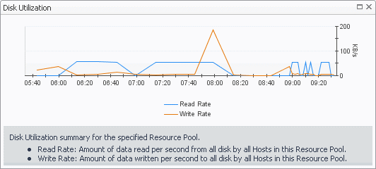 Disk Utilization, Read Rate. The rate at which the resource pool reads data from the disk during the selected time period.
