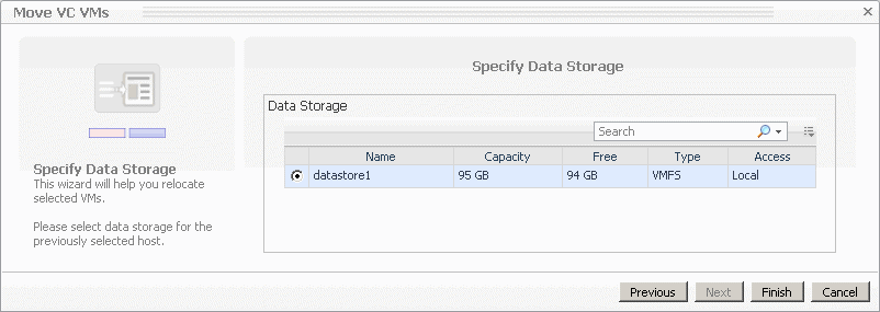 On the Specify Data Storage page, specify the datastore that you want to associate with this virtual machine. |