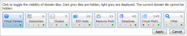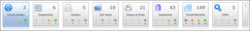 Click the object type icon, the object type name, or the object count, to view summary information for that entire object type in the Quick-View. Click an alarm state (for example, warning) on a tile to view summary information in the Quick-View for the objects of that type that are in the selected alarm state.