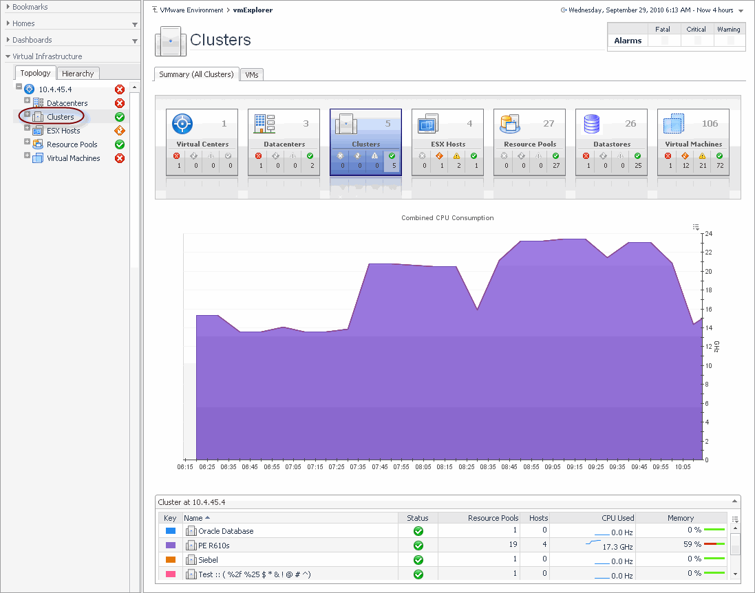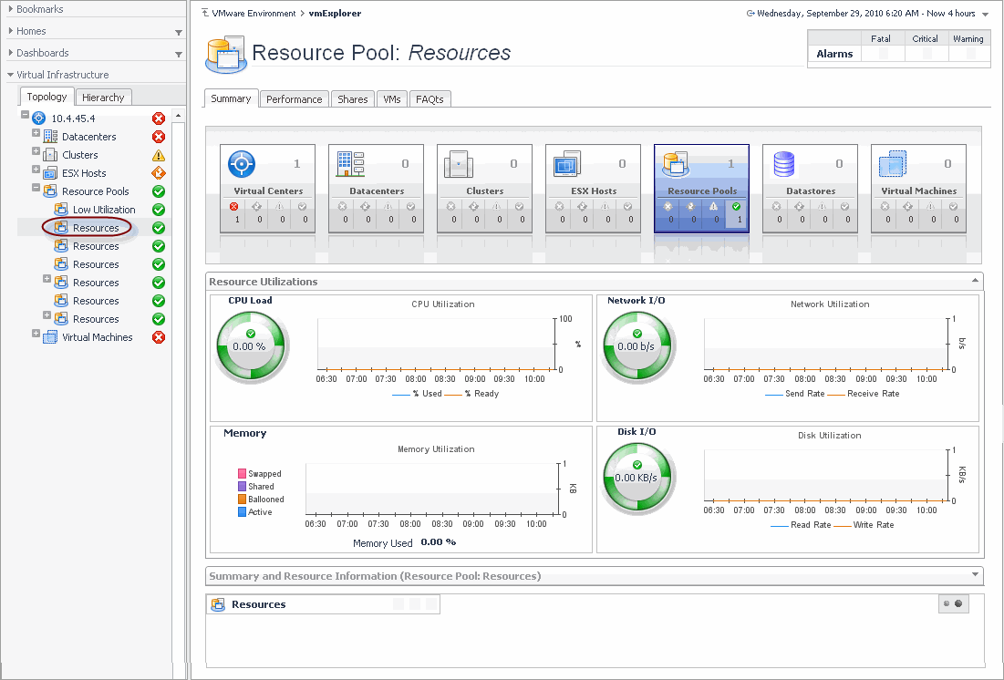 If, however, you select a collection of ESX Hosts from the Virtual Infrastructure view and you open the Summary tab, an informative graph appears in place of a Utilizations view. Selecting a collection of objects in the Virtual Infrastructure view always shows a composite view displaying information about all object instances contained in that collection.
