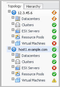 The Virtual Infrastructure view contains a navigation tree on the Topology tab that represents the various virtual infrastructure objects: Virtual Centers, Datacenters, Clusters, ESX Hosts, Resource Pools, and Virtual Machines. For each individual object or group of objects, a status indicator appears, showing the alarm of highest severity that is outstanding for the that object or objects. For example, there are 25 virtual machines configured for a vCenter. Twenty of the virtual machines have a normal status, three have a warning status, and two have a critical status. In the Topology view, the virtual machines container for that vCenter displays a critical status indicator to show that at least one of the virtual machines associated with the vCenter has an outstanding critical alarm.