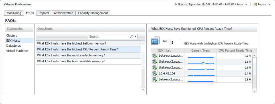 The VMware Environment dashboard contains the FAQts tab that you can use to ask questions about your monitored systems and review the answers. In the Categories pane, the FAQts view shows several question categories. Clicking a category shows the questions belonging to that category in the Questions pane. From there, clicking a question shows the answer on the right.