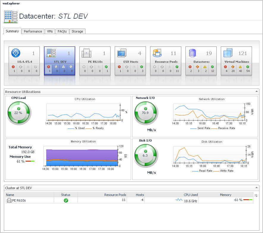 Selecting an object or group of objects on either tab of the Virtual Infrastructure view displays performance details about your selection in the VMware Explorer Primary view. The VMware Explorer Primary view takes up the entire display area of the Foglight for VMware browser interface. This view provides significant value to administrators who leverage Foglight for VMware to monitor their virtual infrastructure.