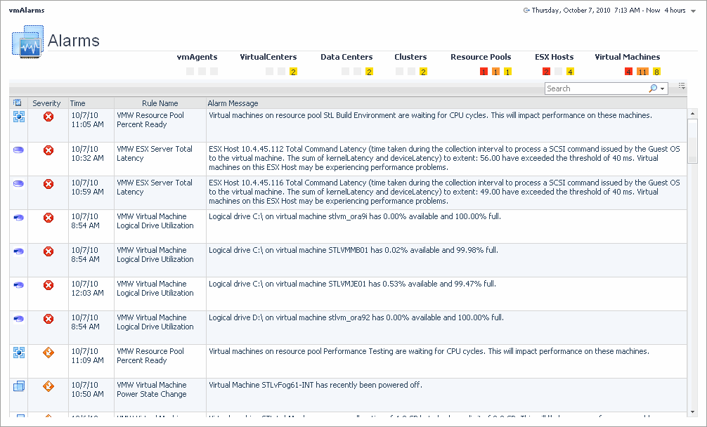 Agent Rules Cluster Rules Datacenter Rules Datastore Rules Resource Pool Rules ESX Server Rules VirtualCenter Rules Virtual Machine Rules VMW Stale Data Management Rule Virtual Switch Rules