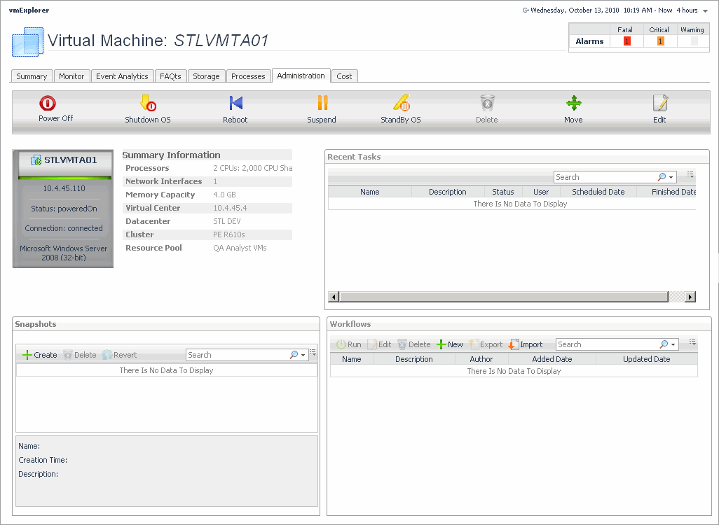 These actions require that you set up credentials for the virtual center on the Automation Configuration dashboard. To do that, on the navigation panel, under Dashboards, choose VMware > Automation Configuration. On the Automation Configuration dashboard that appears, in the Virtual Infrastructure view, select a virtual center, click Assign Credential, and provide host credentials in the Assign Host Credentials Dialog box. Failing to configure host credentials results prevents the automated tasks from being executed.
