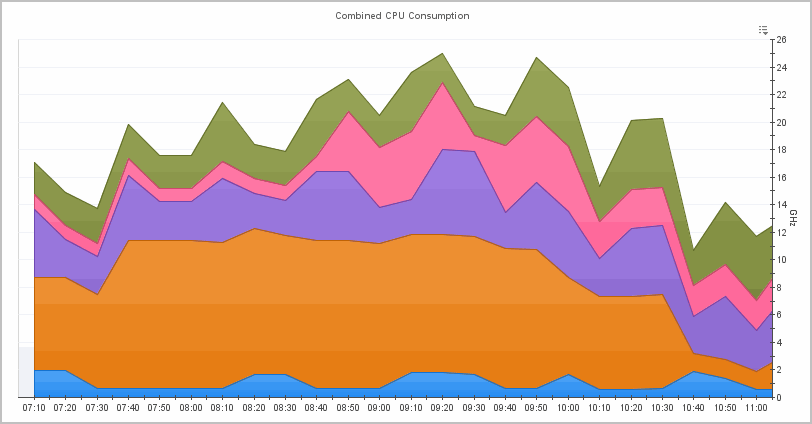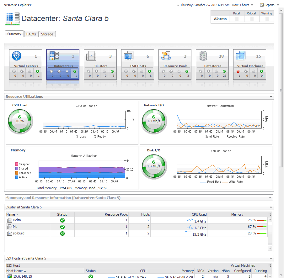 If, however, you select a collection of ESX Hosts from the Virtual Infrastructure view and you open the Summary tab, an informative graph appears in place of a Utilizations view. Selecting a collection of objects in the Virtual Infrastructure view always shows a composite view displaying information about all object instances contained in that collection.