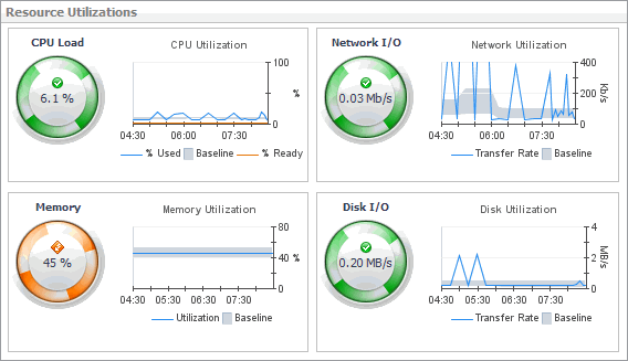 The Utilizations view, typically located across the center of the display area tab, provides numerical and graphical representations of utilization metrics associated with the selected object or group of objects. For example, selecting a single resource pool from the Virtual Infrastructure view and opening the Performance tab in the display area, displays four graphs in the Utilizations view, showing CPU, memory, disk, and network resource utilizations for the selected resource pool.