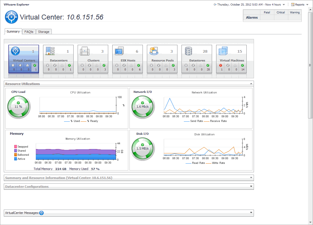 The VMware Explorer allows you to monitor a wide range of elements in your virtual infrastructure. It contains a number of informative views through which you can quickly and easily access detailed information about any of the available components (physical or virtual) within the infrastructure. Its hierarchical interface includes drilldown capabilities that display various performance metrics and alarms within the virtual infrastructure.