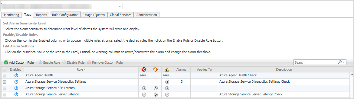 The Rule Configuration tab of the Cloud Manager dashboard contains links to rules and alarms tasks that you can use to manage Azure rules and alarms.