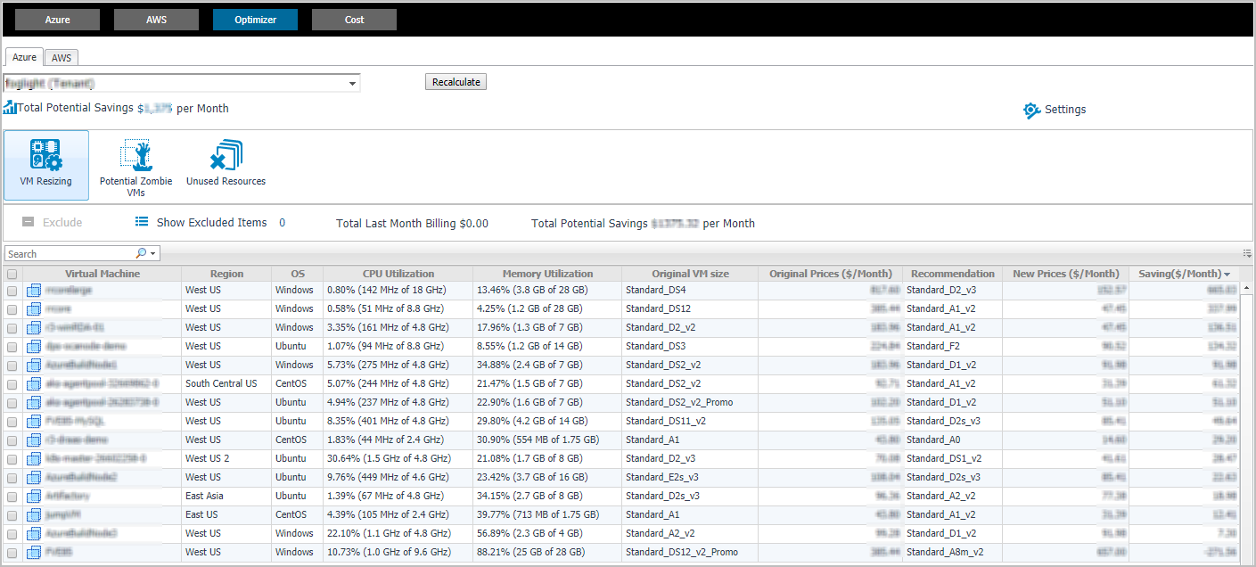 VM Resizing. Shows virtual machine name, utilization and recommendations for both CPU and memory resources. |