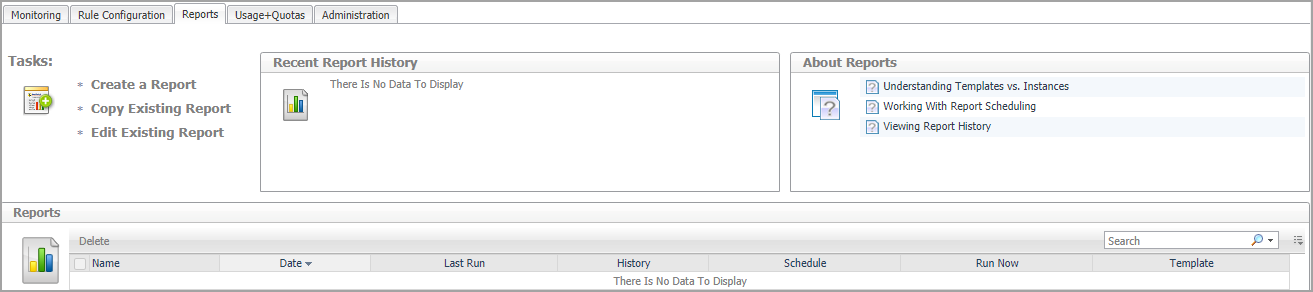 You can generate, copy, and edit reports using the Reports tab on the Reports dashboard, or alternatively the Reports dashboard included with the Management Server.