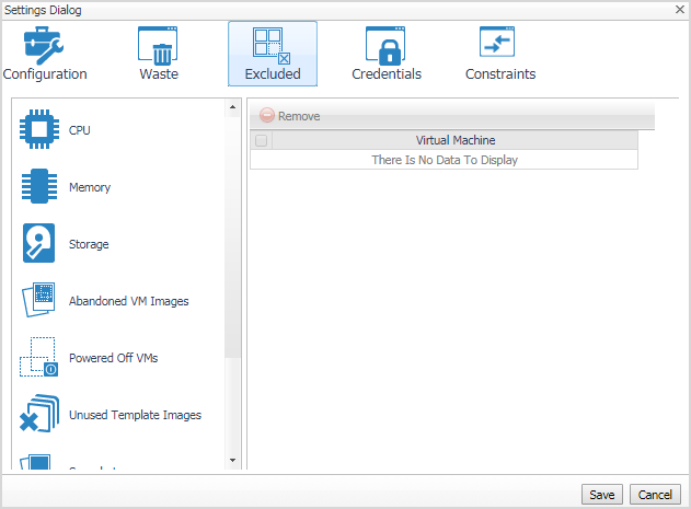 The Waste tab allows you to configure the settings for determining resources wasted in your environment. These include powered-off VMs, unused template images, snapshots, and potential zombie VMs: