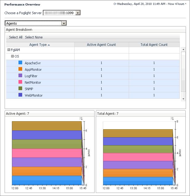 The Agents view is designed to see what agents you are running, listed by type. By selecting agent types in the tree, a graph showing the number of agents as a function of time is plotted. This graph is handy for viewing changes to the agents, for example if a number of agents that you did not know about were added, or checking if old agents are properly removed.