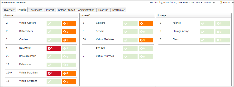 The Environment Overview dashboard also includes a Health tab, which allows you to review the health of your virtual environment. This tab includes the following views: