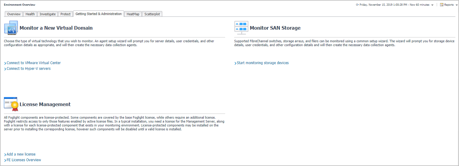 The Environment Overview dashboard also includes a Getting Started & Administration tab, which allows you to perform the following activities: