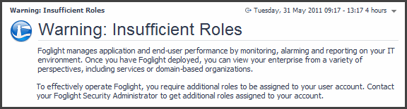 If you are a user with an assigned role or role combination that does not provide sufficient privileges to do anything useful in Foglight, a warning page appears.