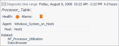 Within a diagnostic time range, Foglight typically sets three quarters of this span to occur prior to the alarm being fired and one quarter to occur after. For example, if the current time range spans four hours, when you drill down on an alarm, the diagnostic time range also covers a four-hour interval, from three hours prior to when the alarm fired to one hour after it fired (as shown in the following image).