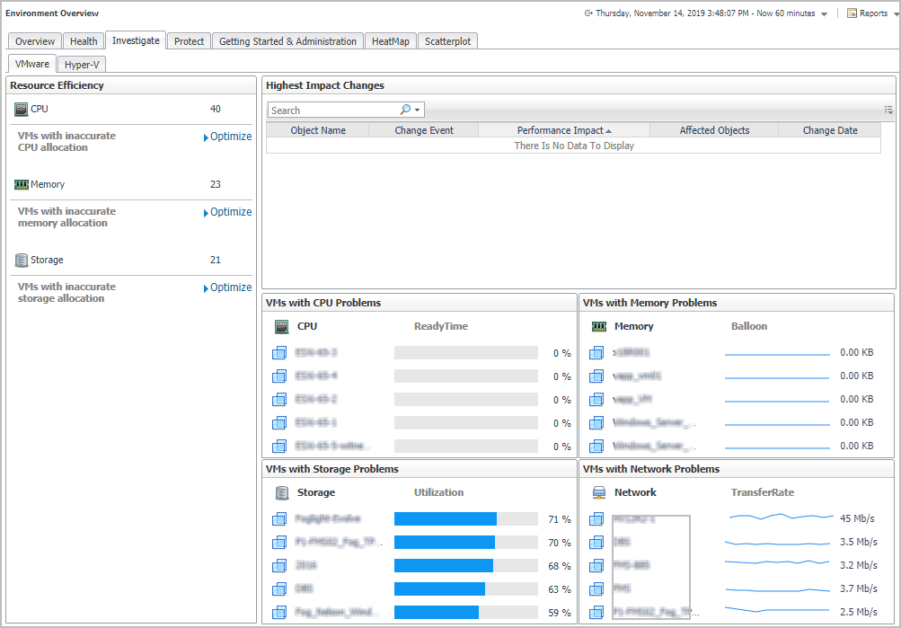 The Environment Overview dashboard also includes an Investigate tab, which provides a quick way to investigate the resource efficiency in your environment and to optimize VMs with incorrect resource allocations, as necessary. The Investigate tab includes the VMware and Hyper-V tabs, with the following views: