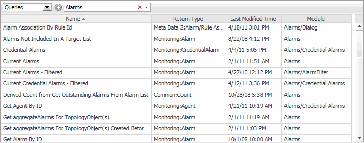 The Module Contents pane on the Definitions dashboard shows the dashboards that you can access based on your user permissions. Every dashboard can include one or more preconfigured views, queries, functions, files, icons, associations, renderers, types, type mappings, unit mappings, and tasks. The search feature allows you to search for various dashboard definitions contained in one or more selected modules, such as functions, queries, renderers, tasks, types, and views.